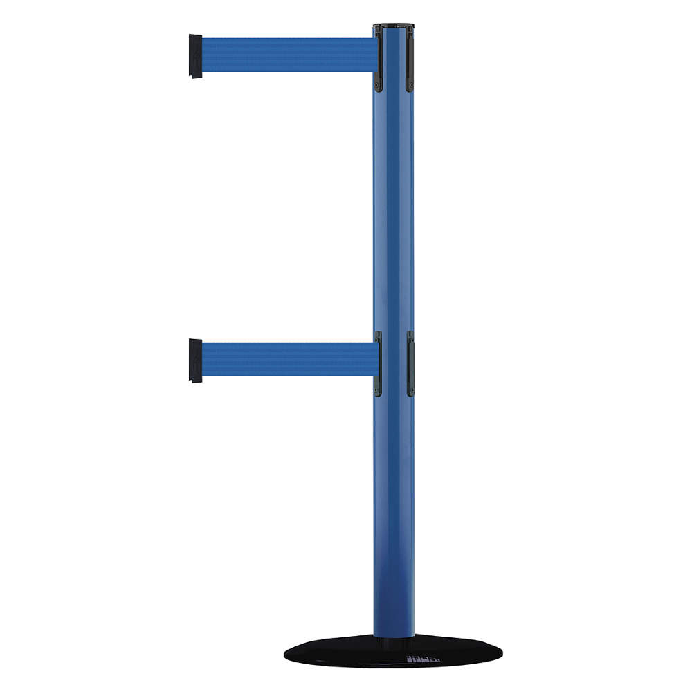 Portable post crowd control barrier extends belt when a barrier is needed; retracts when not in use. Barrier features SlowRetract technology that ensures slow, safe belt retraction and locking belt ends to prevent accidental release. Belt material is heavy-duty woven polyester. This listing is for each. Post Material : Steel ADA Compliance : Yes Post Dia. : 2 1/2 in Number of Belts : 2 Base Type : Basic Base Dia. : 14 in Belt Width : 2 in Post Finish : Blue Item : Barrier Post with Belt Base Material : Steel Indoor / Outdoor : Indoor Post Height : 38 in Belt Length : 7 1/2 ft Base Finish : Black ABS No Scuff Cover Belt Color : Blue Country of Origin (subject to change) : United States