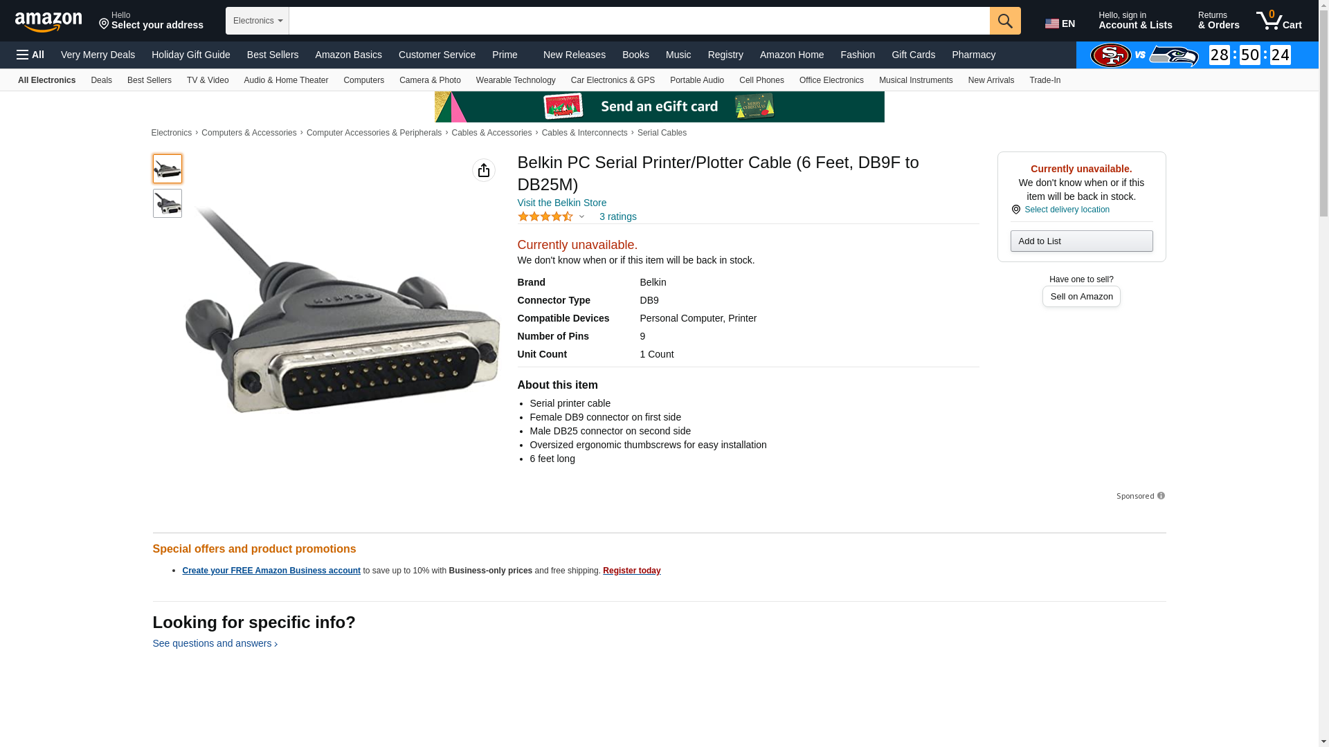 | Feature | Cable Type: Printer Cable| Left Connector Gender: Female| Right Connector Gender: Male| Left Connector Type: 9 pin D-Sub (DB-9)| Right Connector Type: 25 pin D-Sub (DB-25)| Length: 6 feet |