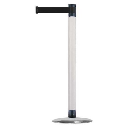 Barrier Post with Belt, Post Material Polycarbonate, Post Finish Clear, Post Height 38 in, Post Dia. 2 1/2 in, Base Type Standard, Base Dia. 14 in, Base Material Steel, Base Finish Satin Chrome, Number of Belts 1, Belt Length 7 1/2 ft, Belt Color Black, Belt Width 2 in, Indoor, ADA Compliance Yes