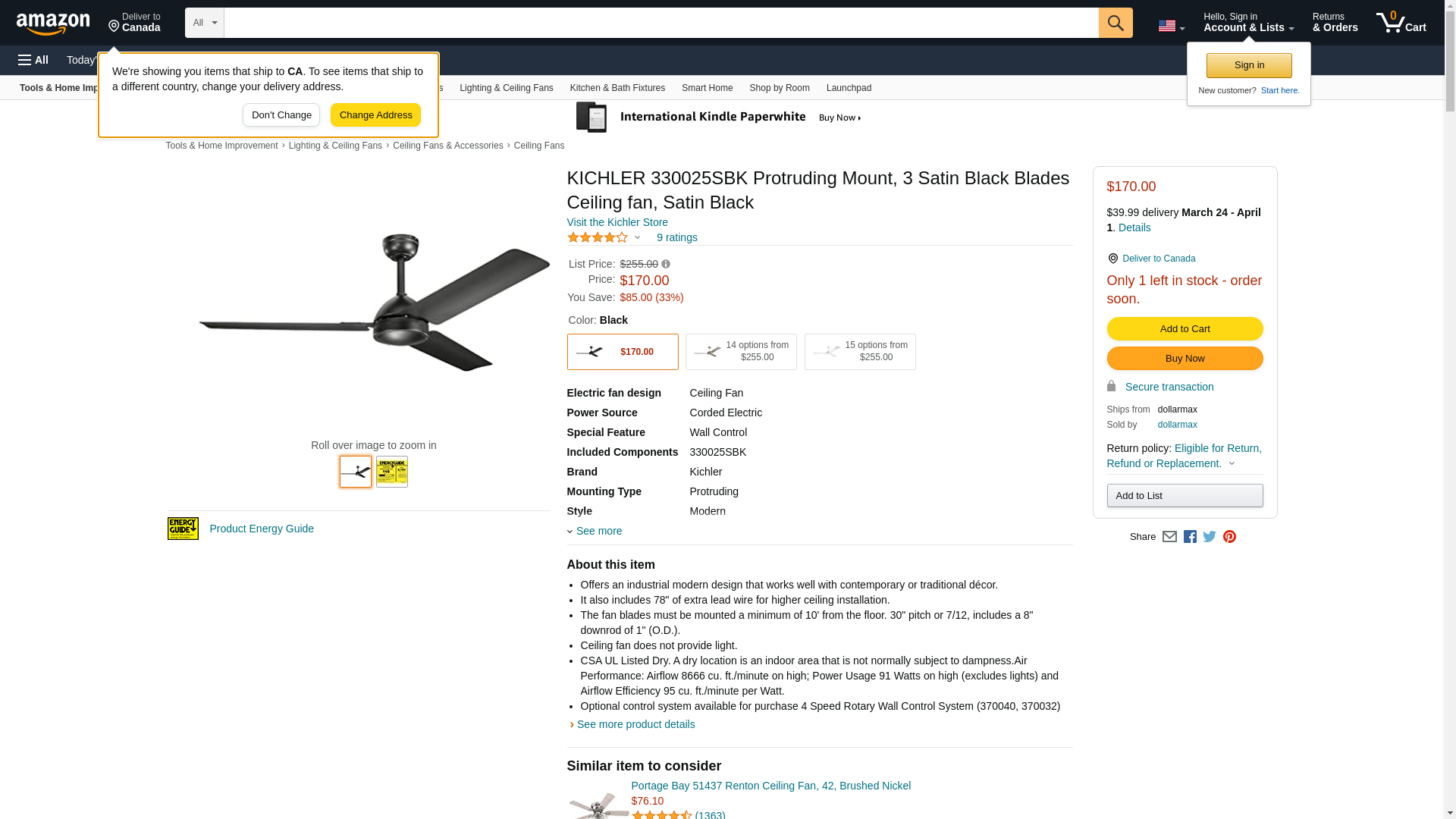 KICHLER 330025SBK Protruding Mount, 3 Satin Black Blades Ceiling fan, Satin Black