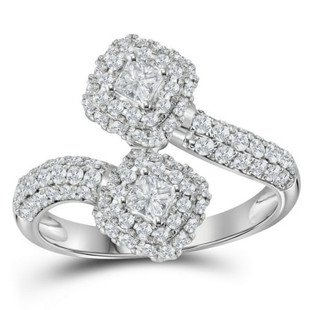 <p><span style="font-size:16px;"><b><u>Description</u></b><br /></span></p> <p><span style="font-size: 14px;">14kt White Gold Womens Princess Diamond 2-stone Bypass Bridal Wedding Engagement Ring 1.00 Cttw</span></p> <br /> <p><span style="font-size:16px"><u><b>Gemstone Details</b></u></span></p> <p><span style="font-size:14px">1.00 Carats total weight<br /><br />All diamonds are natural and conflict-free in origin<br /><br /></span></p> <ul type="square"> <b>Princess Diamond</b> <br /> <li>1/3 ct.t.w.</li> <li>SI3 clarity</li> <li>G-H color</li> <li>4-prong setting</li> </ul> <br /> <ul> <b>Round Diamond</b> <br /> <li>3/4 ct.t.w.</li> <li>I1-I2 clarity</li> <li>H-I color</li> <li>Prong setting</li> </ul> <br /> <p><span style="font-size:16px"><u><b>Specifications</b></u><br /></span></p> <p><span style="font-size:14px">14kt White Gold<br />3.36 grams (approximately)<br />Ring size selectable</span></p> <p><span style="font-size:11px">Combined diamond weight of 1.00 carats total weight represents a range of 0.95 - 1.05 cts. t.w.</span></p>