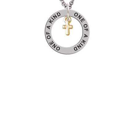 Gold Tone Super Mini Simple Cross One of a Kind Affirmation Ring Necklace. Gold Tone Super Mini Simple Cross charm is approx. 0.25 x 0.2 x 0.07 inches (HxWxD) not including loop. Cross is smooth on both sides. Silver tone 2mm Belcher Chain Necklace is approx. 23 Inches with a Lobster Claw Clasp. Affirmation Ring is approx. 0.86 x 0.86 x 0.05 (HxWxD). This inspirational piece of jewelry is very meaningful. Its circular shape is symbolic for endless belief in the message that is imprinted around the ring. These are motivational or sentimental messages to the wearer. Makes a great Graduation gift! PLEASE NOTE: Our products are lead safe, but are not intended for children 14 years and younger.