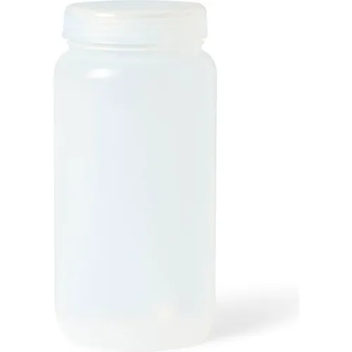 1000mL Wide Mouth PP Reagent Bottles. These wide mouth polypropylene bottles are rigid, translucent and have excellent contact clarity. These bottles can be autoclaved. 1000mL Capacity, 218mm Height, 35/41mm ID/OD.