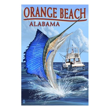 <ul> <li>Title: Orange Beach, Alabama - Sailfish Scene</li> <li>Artist: Lantern Press</li> <li>Product Type: Art Print</li> </ul>