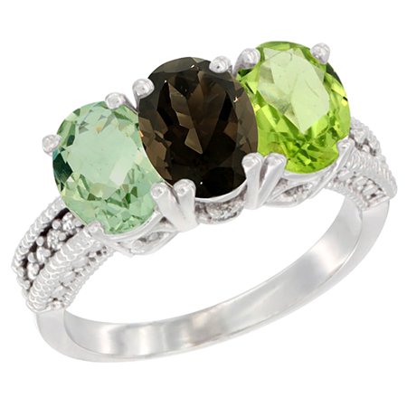 14K White Gold Natural Green Amethyst, Smoky Topaz & Peridot Ring 3-Stone 7x5 mm Oval Diamond Accent, sizes 5 - 10