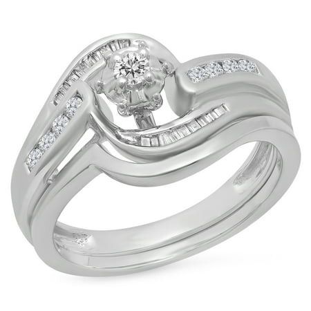 Dazzlingrock Collection 0.30 Carat (ctw) 10K Round & Baguette Diamond Bridal Engagement Ring Set 1/3 CT, White Gold, Size 8.5