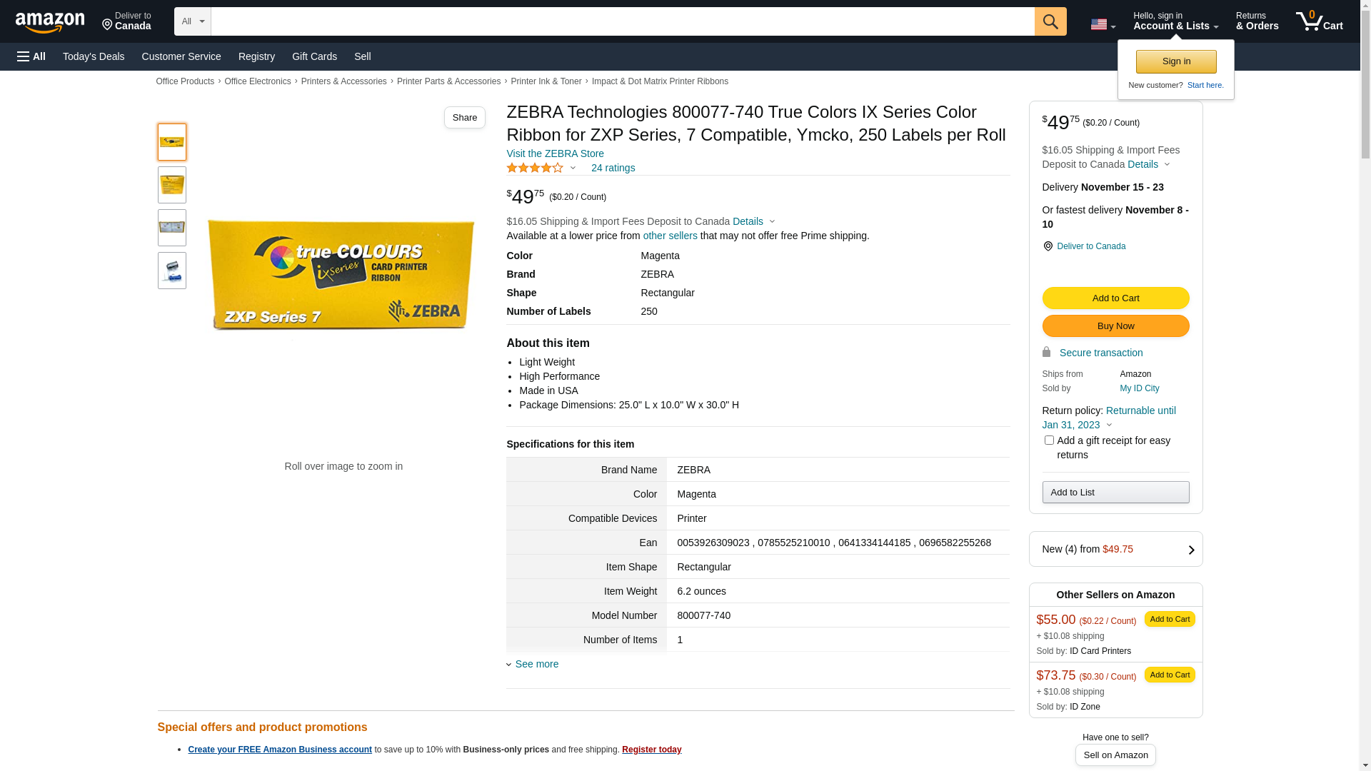 | Feature | Print Technology: Thermal TransferPrint Color: YMCKOTypical Print Yield: 250 ImageCompatibility: Zebra ZXP Series 7 Printer |