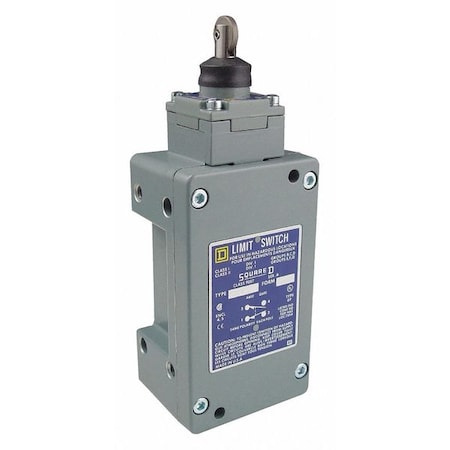 This limit switch features a plunger actuator, steel roller construction, and aluminum body construction for heavy-duty durability.<br /><br /> Limit Switch Style: Hazardous Location Limit Switch<br /> Basic Actuator Style - Limit Switch: Wobble Stick<br /> Actuator Style - Limit Switch: Wobble Stick<br /> Actuator Location - Limit Switch: Top<br /> Item: Hazardous Location Limit Switch<br /> AC Contact Rating - Limit Switch: 10A @ 600V<br /> DC Contact Rating - Limit Switch: 10A @ 600V<br /> Contact Form- Switches: 2NC/2NO<br /> Actuator Length - Limit Switch: 0.95"<br /> Body Height - Limit Switch: 4.25"<br /> Body Width - Limit Switch: 2.72"<br /> Body Depth - Limit Switch: 2.08"<br /> Boot Sealed Actuator - Limit Switch: No<br /> Threaded for Panel Mounting - Limit Switch: No<br /> Body Style - Limit Switch: Standard<br /> NEMA Rating: 1, 2, 4, 6, 6P, 7, 9, 12, 13<br /> Wiring Entry: 1/2" NPT<br /> Electrical Connection: Screw Terminals<br /> IP Rating: 67<br /> Movement: Horizontal<br /> Travel: 0.25"<br /> Series: 9007CR<br /> Operating Temp. Range: 0 Degrees to 185 Degrees F<br /> Roller Material: Steel<br /> Roller Dia.: 0.63"<br /> Roller Width: 0.13"<br /> Body Material: Aluminum<br /> Operating Force: 4.00 in.-lb<br /> Standards: UL, CSA<br /> Certification: UL Class I Groups B, C, D and Class II Groups E, F, G