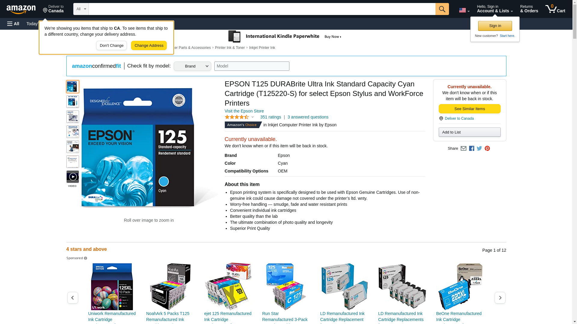 Epson? T125220 (125) Ink, Cyan EPST125220