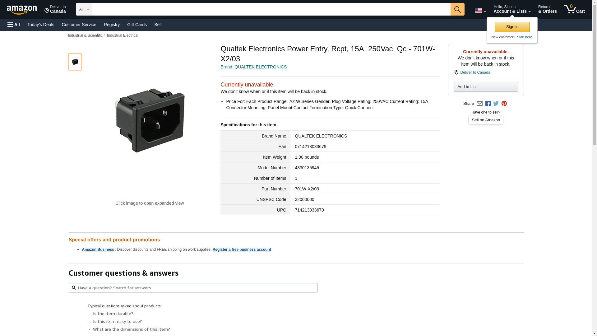 Qualtek Electronics Power Entry, Rcpt, 15A, 250Vac, Qc - 701W-X2/03