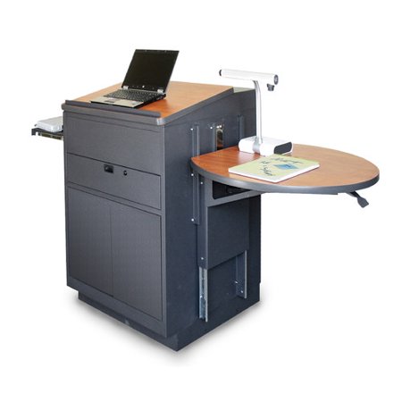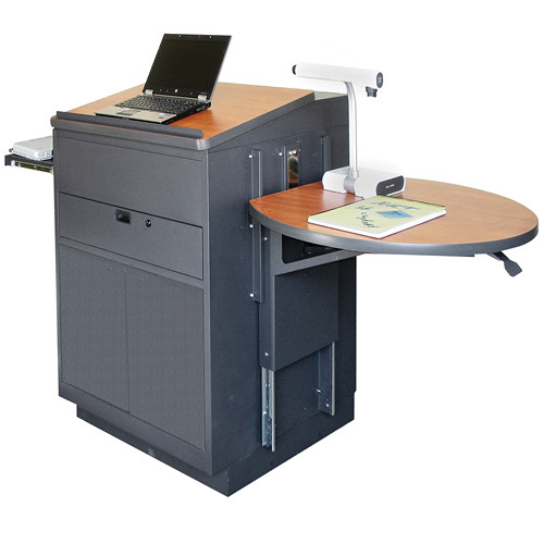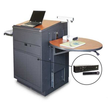 MVLSM3030CHDT-H Finish: Cherry Features: -Vizion collection. -6 Speakers size: 2". -Media center with desk and lectern. -Wireless 16 channel UHF handheld microphone. -50 Watt amplifier. -Removable lectern with pencil stop. Product Type: -Full podium. Style: -Modern. Primary Material: -Metal. Powered: -Yes. Storage Included: -Yes. Wheels Included: -Yes. Clock Included: -Yes. Wireless: -Yes. Sound System Included: -Yes. Country of Manufacture: -United States. Dimensions: -Adjustable platform height: 26" - 42". Overall Height - Top to Bottom: -46". Adjustable Height: -Yes. Overall Width - Side to Side: -30". Overall Depth - Front to Back: -30". Overall Product Weight: -195 lbs.