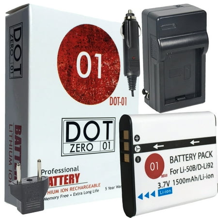 <b>This DOT-01 Package includes:</b> <br /> <br /> 1x DOT-01 Brand with this 1500 mAh replacement Olympus LI50B battery Olympus LI-50B Replacement Rechargeable Battery made with Premium Japanese Cells <br /> 1x DOT-01 Brand External AC/DC Travel Charger with bonus Car Charger and European Adapters <br />5 Year DOT-01 Battery Warranty <br /> This DOT-01 Package was made to compliment the Olympus TG-630 Digital Camera <br /> <br /> <b>More about DOT-01 Products:</b> <br /> <br /> DOT-01 products are made with you in mind. We have done our best to make a reliable and an affordable product for both the beginner and professional photographer alike. Whether you are heading out on an expedition to the West Indies or beginning a new chapter of your life at home, <b>DOT-01 is behind you</b> with the power you need to catch every moment. <br /> <br />We support you and your new batteries for FIVE full years after your purchase date. If you want to drop a compliment our way, or if you have a comment for us, we are available five days a week for you. <br /> <br />Please Note: <br />If you are planning a trip somewhere extra COLD or HOT <i>(Dog sledding in the arctic circle, cycling down an active volcano, or whatever you are into these days)</i> Lithium Ion batteries have a much shorter lifespan in extreme weather, so please, plan accordingly!