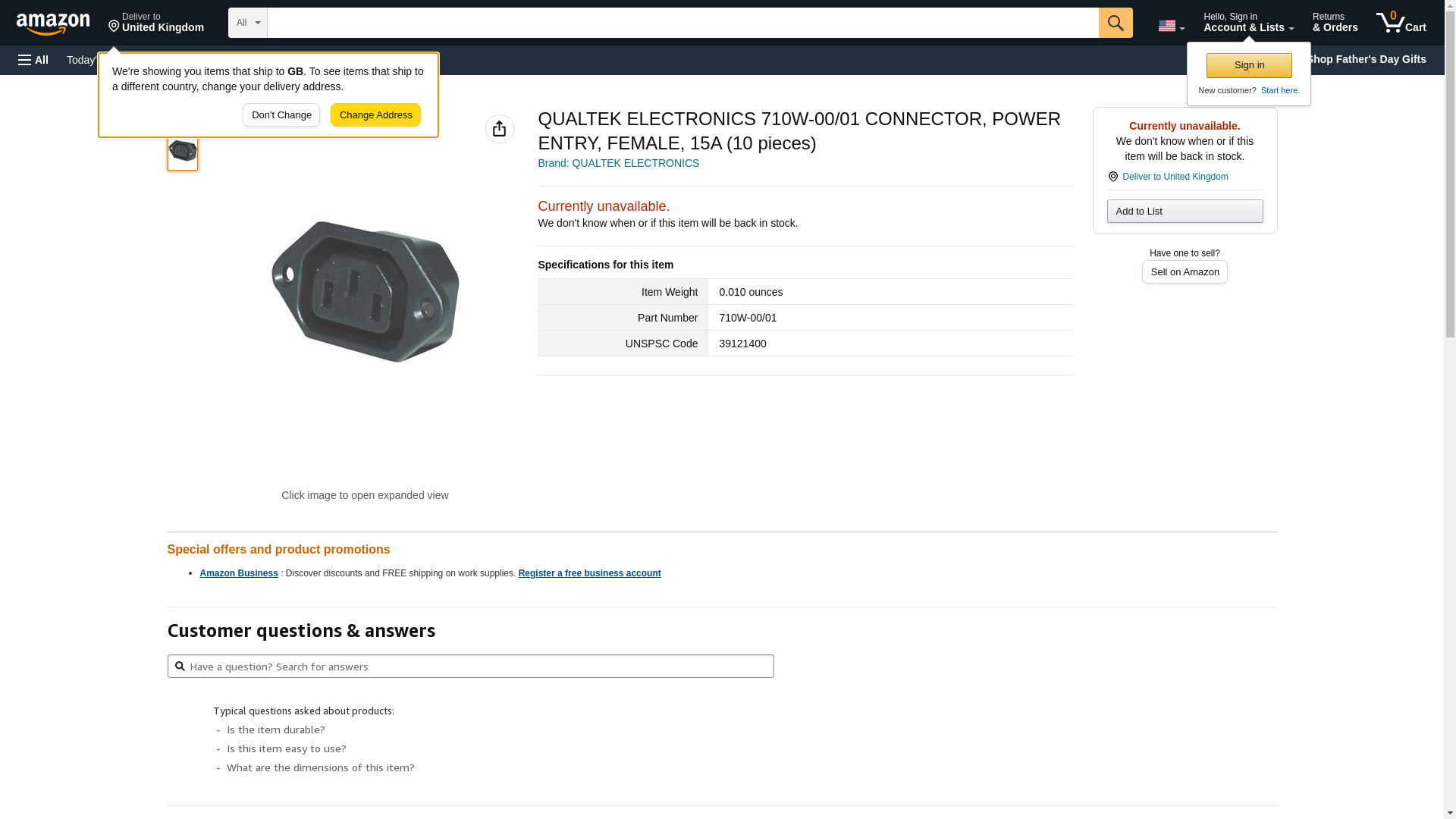 Product Description Qualtek Electronics - 710W-00/01 - Connector; Power Entry; Female; 15A