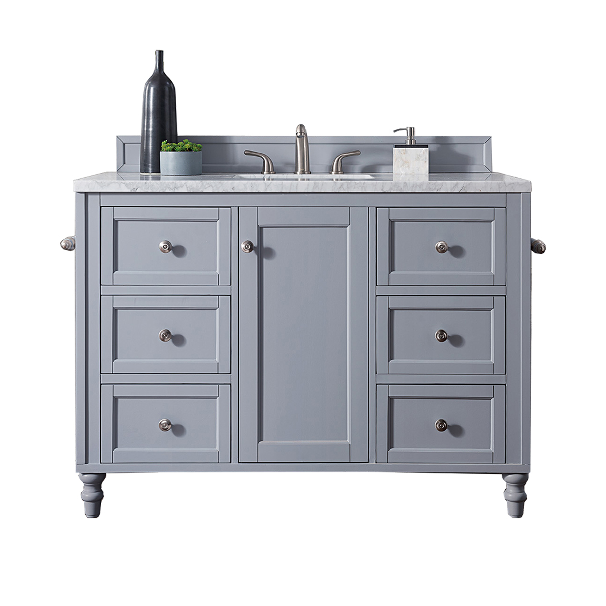 The Copper Cove Encore 301-V48-SL-3CAR 48" Silver Gray vanity by James Martin Furniture features optional towel bars, a bamboo drawer organizer, an electrical outlet with two usb ports, and enterior shelf space. This cabinet also includes a decorative wood backsplash.,You deserve a bathroom collection that incorporates all of your needs. The Copper Cove Encore collection has everything to offer. A new spin on our current copper cove collection available in our Bright White, Silver Gray, & Burnished Mahogany finishes. Featuring a new drawer modular piece with additiona storage and makeup counter space. Unique features include towel bars on each side of the vanity, in addition to the standard features. Find exactly what you need with this impressive set. With classic lines and