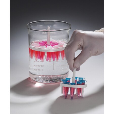 Molded of steam autoclavable polypropylene, these racks fit 400 mL or 1000 mL beakers. -Floating rack design -Easy to unload -Polypropylene construction -Autoclavable Tubes remain completely immersed in a beaker while tops rest above the rack. Unload by lightly pressing down against the bench until the legs touch, releasing the tubes. Choose from 8- or 20-place racks with 10.8 mm holes for 1.5 mL microtubes. Racks are 6.4 mm (¹/â‚„") thick, with 19 mm (³/â‚„") long legs and a center handle.