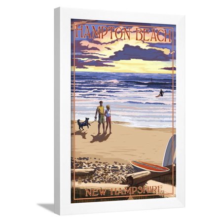 <ul> <li>Title: Hampton Beach, New Hampshire - Beach Scene and Surfers Walk at Sunset</li> <li>Artist: Lantern Press</li> <li>Paper Type: Art Print</li> <li>Product Type: Framed Art Print</li> <li>Framed in SOHO White</li> <li>Arrives ready-to-hang for fast, simple installation</li> <li>Framed Size: 15.5x22 in.</li> <li>Handcrafted in the USA</li> </ul>