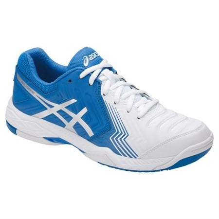 The Asics Gel Game 6 Men's Tennis Shoe, in a white, director blue, and silver colorway, offers exceptional performance and value. This men's tennis shoe features a combination of comfort and stability with Forefoot Gel Cushioning System and midfoot Trusstic System. The solid rubber outsole adds trac