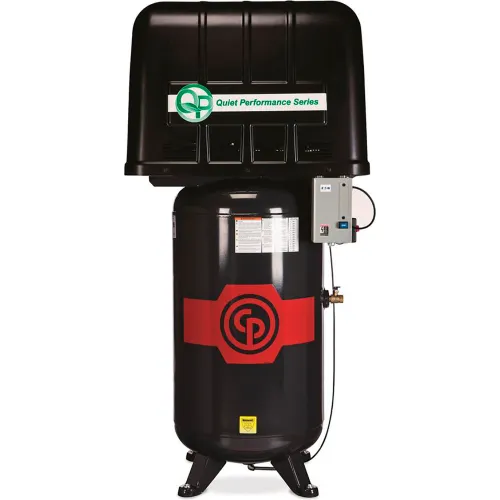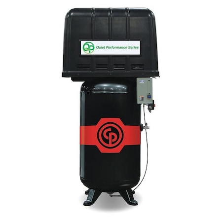 Chicago Pneumatic RCP-7581VQP Quiet Air Compressor Nearly as quiet as a rotary screw air compressor, but at roughly 1/2 the cost. The Chicago Pneumatic QP air compressors are full featured air compressors with enclosure, and a lot more. RCP-7581VQP Features and Specs: 7.5HP 69 dBA 208-230 Volt Single Phase 25.3 CFM @ 100 psi 22.3 CFM @ 175 psi 175 psi Max Pressure 80 Gallon ASME/CRN Tank Automatic Tank Drain Low Oil Level Switch Quiet Power Package - Includes High Strength Enclosure, Sound Dampening Insulation 600 CFM Blower at Top of Belt Guard for Cooler Internal Operating Temperature High Temp Shutdown Half the Noise of a Standard Piston Air Compressor 2 Year Bumper to Bumper Warranty