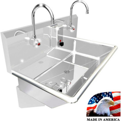 BSM Inc. Stainless Steel Sink, 2 Stations w/Electronic Faucets, Wall Mounted 36" L X 20" W X 8" D