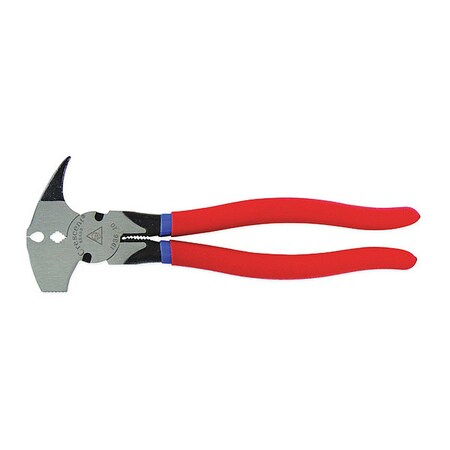 Fence tool with cushioned handles. 10-7/16 inches long. Made of forged alloy tool steel with polished head, 2 electronically induction hardened durable wire cutters, 2 staple grips in nose, and corrugated hammer head, heavy prong. Special opening in head allows both wire and staple to be gripped. Jaw type is dual head, edge type is standard; cut capacity is 11 AWG. Red non-slip cushion handle grips.