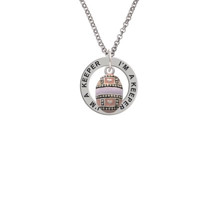Silver Tone Egg Pink & Lavender I'm a Keeper Affirmation Ring Necklace. Silver Tone, hand enameled charms. Charm size is approx. 0.75 x 0.43 x 0.15 inches (HxWxD) including loop. Silver tone 2mm Belcher Chain Necklace is approx. 23 Inches with a Lobster Claw Clasp. Affirmation Ring is approx. 0.86 x 0.86 x 0.05 (HxWxD). This inspirational piece of jewelry is very meaningful. Its circular shape is symbolic for endless belief in the message that is imprinted around the ring. These are motivational or sentimental messages to the wearer. Makes a great team gift! PLEASE NOTE: Our products are lead safe, but are not intended for children 14 years and younger.