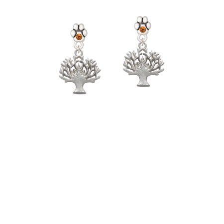 Silver Tone Tree of Life - Yellow Crystal Paw Earrings. Silver Tone, hand enameled charms. Charm size is approx. 0.84 x 0.75 x 0.13 inches (HxWxD) including loop. Paw Earring is approx. 0.34 x 0.30 x 0.08 inches (HxWxD) not including dangle. Earrings have steel posts. Earring backs are Bullet ''Clutch'' Style with Plastic Pad. Earring crystal colors available: Red, Yellow, Green, Blue, Purple, Light Pink, Black, and Clear. Great for sports teams! Lovely gift for dog and cat lovers. PLEASE NOTE: Our products are lead safe, but are not intended for children 14 years and younger.