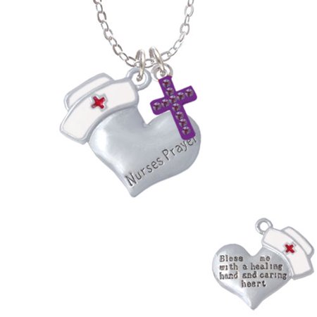 Nurse's Prayer Heart - Healing Hand - Purple Crystal Cross Sophia Necklace. Silver Tone Charm. Charm size is approx. 0.83 x 0.87 x 0.13 inches (HxWxD) including loop. 1.5mm Silver Tone Dainty Cable Chain Necklace: 18 inches with 1 inch extender chain. Lobster Claw Clasp. Small Purple Enamel and Crystal Cross is approx. 0.44 x 0.3 x 0.09 inches (HxWxD). We are a family owned company in the U.S.A. since 1977. PLEASE NOTE: Our products are lead safe, but are not intended for children 14 years and younger.