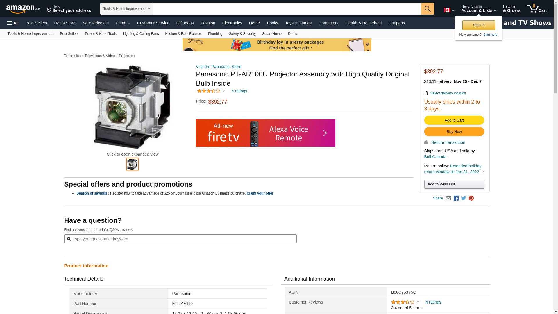 | Feature | ET-LAA110 Panasonic Projector Lamp Replacement. Projector Lamp Assembly with High Quality Genuine Original Ushio Bulb Inside. |