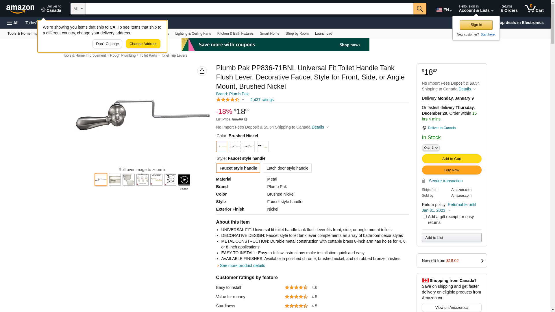 | Feature | Fit all toilet tank lever - decorative toilet tank lever - faucet handle style - front, angle, or side mount - plastic nut & spud - metal handle with cuttable/bendable brass 8" arm with holes for 4", 6", and 8" application |