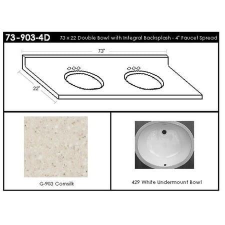 73" x 22" Double bowl vanity top bowls L-15" & R-15", G903 Cornsilk, 4" Faucet spread <br />Flat edge are finished on both sides. Left & right separate side splash. <br />429 white under mount bowl. <br />15" from each side to the center.- SKU: MRCFT110
