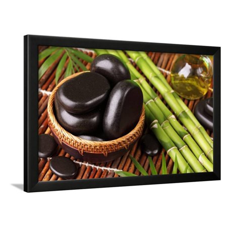 <ul> <li>Title: Spa Still Life with Hot Stones and Essential Oil</li> <li>Artist: egal</li> <li>Paper Type: Photographic Print</li> <li>Product Type: Framed Art Print</li> <li>Framed in SOHO Black</li> <li>Arrives ready-to-hang for fast, simple installation</li> <li>Framed Size: 26x18 in.</li> <li>Handcrafted in the USA</li> </ul>