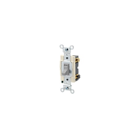 15 Amp, 120/277 Volt, Toggle Framed 3-Way AC Quiet Switch, Commercial Spec Grade, Grounding, Side Wired, - Gray. Leviton's Commercial Specification Grade switches are designed to offer outstanding reliability and top performance in commercial settings. Ideal applications include municipal facilities, government buildings, malls, department stores, hospital and health care facilities, office buildings, schools, colleges, universities, houses of worship and cultural institutions. Leviton offers a large selection of 15 and 20 Amp Commercial switches, available in a wide variety of colors, wiring options and other features.; ; Brand Name: Leviton Amps: 15 amps Number of Poles: Three Pole Switch Type: Toggle Product Type: AC Quiet Switch Color: Gray Number in Package: 1 pk Number of Switches: 1 Switch Wall Plate Included: No Packaging Type: Boxed Volts: 277 V Height: 4.06 in. Width: 1.31 in. UL/CSA Listed: Both Base Material: PBT Operating Temperature: -40 deg C to 65 deg C Strap Material: Steel Temperature Rise: Maximum 30 degrees C Cover Material: Nylon Contacts: Silver-Cadmium .031 Thick Dielectric Voltage: Withstands 1500V for 1 minute Flammability: Rated V-2 per UL 94 Gauge: 14-10 AWG Max. Amperage: 12 Amp Actuator Material: Thermoplastic Body Material: Thermoplastic HP Rating: 1/2HP-120V 2HP-240V-277V Thermoplastic Manual Yes Yes