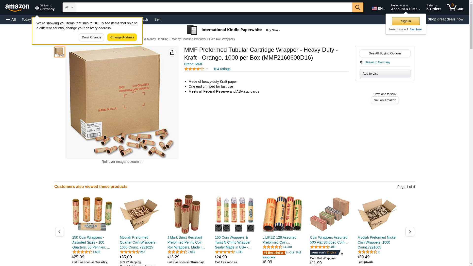 Preformed Tubular Paper Coin Wrappers<br>• Colors conform to ABA standards<br>Kraft paper, one end crimped for easy filling. 1,000 wrappers per box.<br>Holds 40 Quarters per Wrapper<br>Orange