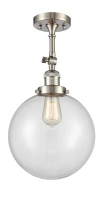 INNOVATIONS LIGHTING 201F-SN-G202-10 X-Large Beacon 1 Light Semi-Flush Mount part of the Franklin Restoration Collection. The X-Large Beacon 1 Light Semi-Flush Mount is part of the Franklin Restoration Collection. Solid Brass 180 Degree Adjustable Swivel with internal teeth that lock in at 5 degree intervals With Engraved Cast Cup. Collection: Franklin Restoration. Material: Steel, Cast Brass, Glass. Metal Finish(Body): Brushed Satin Nickel. Metal Finish(Canopy/Backplate): Brushed Satin Nickel. Dimension(in): 10(W) x 16(H) x 10(Dia). Bulb: (1)100 Medium Base Vintage Bulb recommended(Not Included). Voltage: 120. Glass: Clear Beacon/Transparent. Shade Shape: Globe. Shade Material: Glass. Shade Size(in): 10 X 9.75. Shade Fitter Measurement: 3.25 inch Fitter. Canopy Dimension(in): 4.5. Solid Brass 180 Degree Adjustable Swivel with internal teeth that lock in at 5 degree intervals With Engraved Cast Cup. Slope Ceiling Compatible. Fixture can be hung with bulbs facing up or down as a Wall Mount or Facing Down as a Ceiling Mount. UL/CUL Damp Rated. Warranty: 2 Year Finish, Lifetime Electrical.