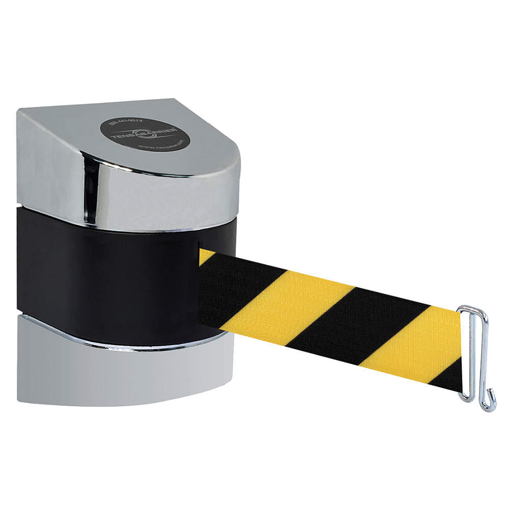 Tensabarrier 897-15-S-1P-NO-D4X-A Polished Chrome Standard Mount Wall Unit with Wire Clip Belt End, 2" Wide, 15' Length Chevron Black and Yellow Belt, 5.5" H, 3.25" L, 3.25" W