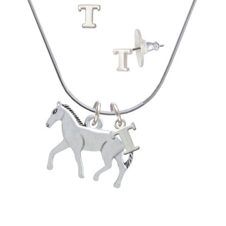 Silver Tone Walking Horse - T Initial Charm Necklace and Stud Earrings Jewelry Set. Silver Tone Charm. Charm size is approx. 0.58 x 0.79 x 0.1 inches (HxWxD) including loop. Mini Initial Stud Earrings are approx. 0.28 x 0.34 inches (HxW) with steel posts. Earring backs are Bullet ''Clutch'' Style with Plastic Pad. Small Initial Pendant is approximately 0.45 inches tall including loop. 18 Inch Snake Chain Necklace with a Lobster Claw Clasp. Charming jewelry set makes a wonderful personalized gift. Featured necklace is an exclusive Delight & Co. design. We are a family owned company for over 35 years in the U.S.A. PLEASE NOTE: Our products are lead safe, but are not intended for children 14 years and younger.