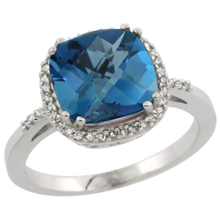 10K White Gold Diamond Natural London Blue Topaz Ring Cushion-cut 9x9mm, sizes 5-10
