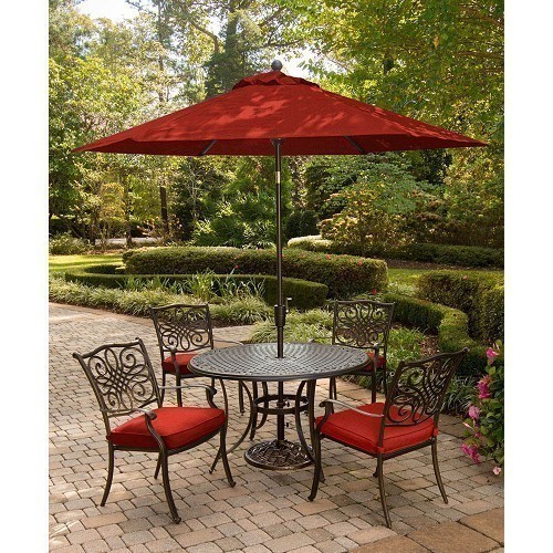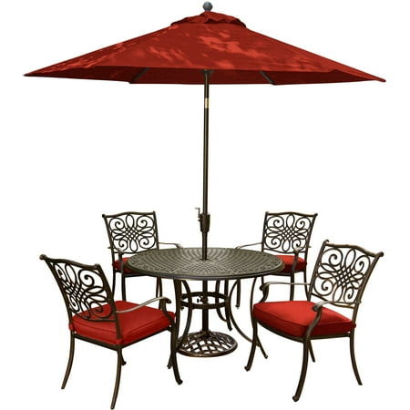 HANOVER TRADITIONS5PC-SU-R TRADITIONS 5-PIECE 4 DINING CHAIR AND 48 INCH ROUND CAST-TOP TABLE WITH 9 FEET UMBRELLA...