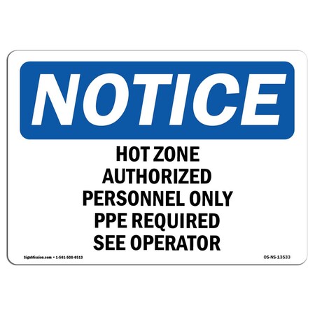 OSHA Notice Sign, Hot Zone Authorized Personnel Only PPE Required, 10in X 7in Aluminum