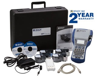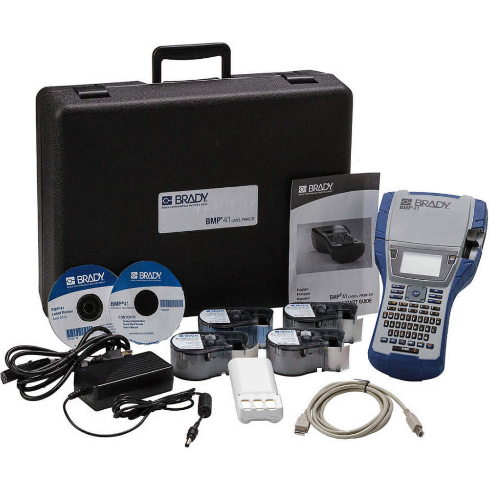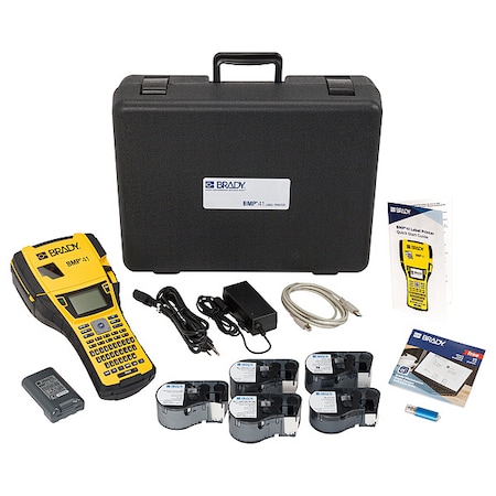 - Includes BMP41-PLUS Portable Label Printer, AC Adapter, Brady Printer Driver CD, Product CD, Hard Carrying Case, M-475-412 Label Tape, M-51-427 Label Tape, MC1-1000-595-WT-BK Label Tape, MC1-1000-595-YL-BK Label Tape