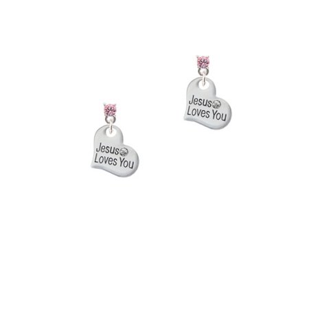 Small Jesus Loves You Heart - Pink Crystal Post Earrings. Silver Tone Small Jesus Loves You Heart is approximately 0.57 x 0.53 x 0.12 inches (HxWxD) not including loop. Small antiqued flower on the back. 3.3mm Crystal Earrings with steel posts. Earring backs are Bullet ''Clutch'' Style with Plastic Pad. Available crystal colors: Maroon, Red, Orange, Yellow, Lime Green, Green, Teal, Hot Blue, Blue, Purple, Light Purple, Light Pink, Hot Pink, Black, Clear, and Brown. Makes a great gift! PLEASE NOTE: Our products are lead safe, but are not intended for children 14 years and younger.