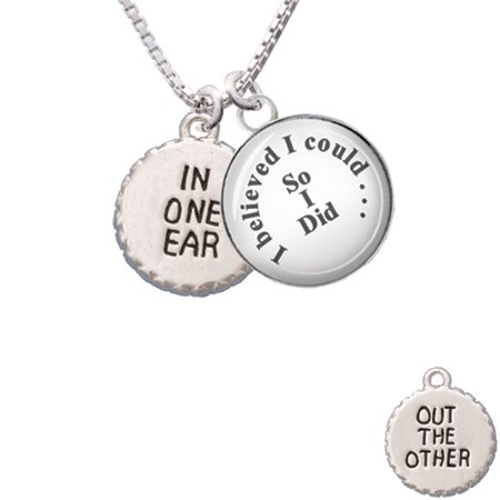 Silver Tone In One Ear & "Out the Other" Circle I Believed I Could So I Did Glass Dome Necklace. Silver Tone Charm. Charm size is approx. 0.75 x 0.64 x 0.07 inches (HxWxD) including loop. 1.3mm Box Chain Necklace is adjustable from 18 to 20 inches. Necklace comes with lobster claw clasp and 2 inch extender chain. Wonderful gift to mark your achievement. Featured necklace is an exclusive Delight & Co. design. We are a family owned company for over 35 years in the U.S.A. PLEASE NOTE: Our products are lead safe, but are not intended for children 14 years and younger.
