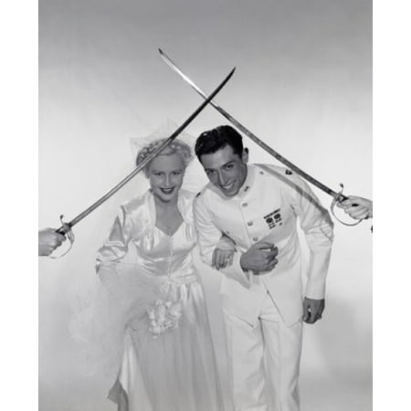 Stretched Canvas Art - Studio portrait of wedding couple moving beneath crossed swords - Medium 18 x 24 inch Wall Art Decor Size.