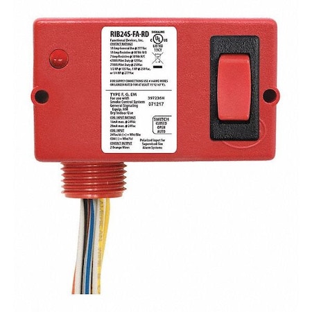 RIB Enclosed Polarized Relay RIB24S-FA-RD, 10A, SPST, 24VACVDC, Override Switch, Red Housing The Polarized RIB series is equivalent to the standard RIB series except for the coil which is polarized. We are currently offering nine polarized relays, most of which have a similar non-polarized counterpart. The FA in the model name stands for Fire Alarm. These relays are designed for operation in systems that require supervision from controllers and utilize end-of-line resistors. The relay can also be operated from A/C voltage (non-polarized) if desired. Product Details Operating Temperature -30° To 140°F Humidity Range 5 To 95 Percent (Noncondensing) Voltage 24VAC/DC v Expected Relay Life 10 Million Cycles Minimum Mechanical Description Enclosed Polarized Relay Number of Relays 1 Amperage 10 A Includes Override Switch, Red Housing Wire Rating 600V Warranty 1 yr Contact Type SPDT Weights & Dimensions Width 2.8 in Length 1.7 in Height 1.5 in Wire Size 16 in Compliance & Certifications Certifications UL Listed
