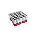This full-size Cambro Camrack glass rack provides you with the perfect solution to wash, store and safely transport your stemware and tumblers. Its open inside compartments ensure thorough circulation of water and cleaning solutions and promotes quick and thorough drying. Closed external walls keep fingers safe, contaminants out and reduces the risk of injury and breakage. The Camrack glass rack features easy-to-grip, rounded handles on all four sides for comfortable handling. A smooth top rim ensures quick, stable stacking plus the rack can inter-stack with other competitive racks. The red glass rack is made of durable, long-lasting polypropylene that will withstand chemicals and high temperatures up to 200°F (93.3°C). Fits any commercial dishwasher. Add a Camdolly and Cover for completely-enclosed, sanitary storage between use. - Camrack Full-Size Glass Rack- 25 Compartments, 3 extenders- Open inside compartments, closed exterior walls - Easy grip rounded handles on all sides- Durable, polypropylene construction- Fits any commercial dishwasher- Red with soft gray extenders- Stackable- NSF Certified- Compartment Size: 3-1/2in Dia x 7-3/4in H- Dimensions: 19-3/4in W x 19-3/4in L x 8-7/8in H*Please Note: Additional compartment extenders cannot be added to this item.*