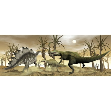Two Allosaurus dinosaurs attack a lone Stegosaurus in the desert Poster Print