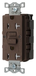 - <b>Special Features</b>: Ground Fault Indicator <b>Color</b>: Brown <b>Outlet Type - Plugs and Receptacles</b>: Decorator Duplex <b>Item</b>: GFCI Receptacle <b>NEMA Configuration</b>: 5-20R <b>Wiring Method - Plugs and Receptacles</b>: Modular <b>Color - Plugs and Receptacles</b>: Brown <b>Surge Suppression</b>: No <b>Voltage - Plugs and Receptacles</b>: 125VAC <b>Tamper Resistant</b>: Yes <b>Self-Testing</b>: Yes <b>Application Environment</b>: Commercial <b>Amps</b>: 20A <b>HP</b>: 1.0