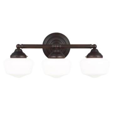This 3 light Wall Bath Fixture from the Academy collection by Sea Gull will enhance your home with a perfect mix of form and function. The features include a Bronze finish applied by experts. Product Features Include: Brand: Sea Gull, Collection: Academy, SKU: 44438-710, UPC: 0785652089190, Category: Bathroom Vanity Light, Finish: Bronze, Shade: Satin White Glass, Material: Steel, Length: 10.00 in., Width: 23.25 in., Height: 10.00 in., Extension/Depth: 10.00 in., Backplate/Canopy Width: 6.63 in., Backplate/Canopy Length: 0.00 in., Weight: 5.10 lb., Included Lead Wire: 6.50, Bulbs Included: No, Primary Bulb(s): 3 x 60.00 watts Medium A19, Voltage: 120, Outdoor Rating: Suitable for Damp Locations, Safety Rating: cETL damp, Title 24 Approved