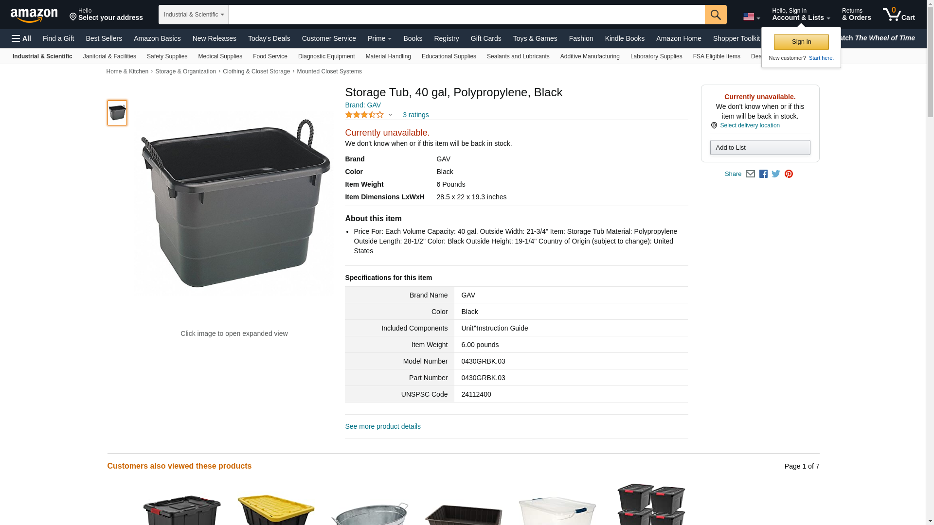| Feature | Price For: Each Volume Capacity: 40 gal. Outside Width: 21-3/4" Item: Storage Tub Material: Polypropylene Outside Length: 28-1/2" Color: Black Outside Height: 19-1/4" Country of Origin (subject to change): United States |