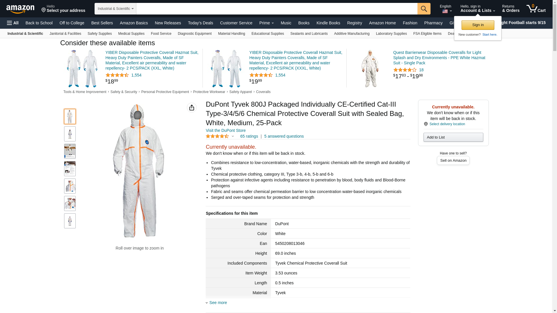 DuPont Tyvek 800 CE-Certified Cat-III Type-3/4/5/6 Chemical Protective Coverall Suit with Sealed Bag, White, Medium, 1-Pack